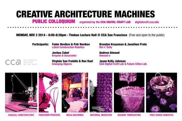 The Creative Architecture Machines Colloquium will bring together a small group of radical innovators, each making unique contributions to the field of architecture and design. Through presentations and a round-table discussion focused on experimental and speculative fabrication machines and processes, we will endeavor to contribute to a wider debate within architecture about the role architects might play in a coming world where the unity of code and machine processes are increasingly becoming fundamental to the discipline. The colloquium will explore the efficacy of these processes and what motivates them, with a broader aspiration of contributing to a wider conversation about architecture, technology and culture.