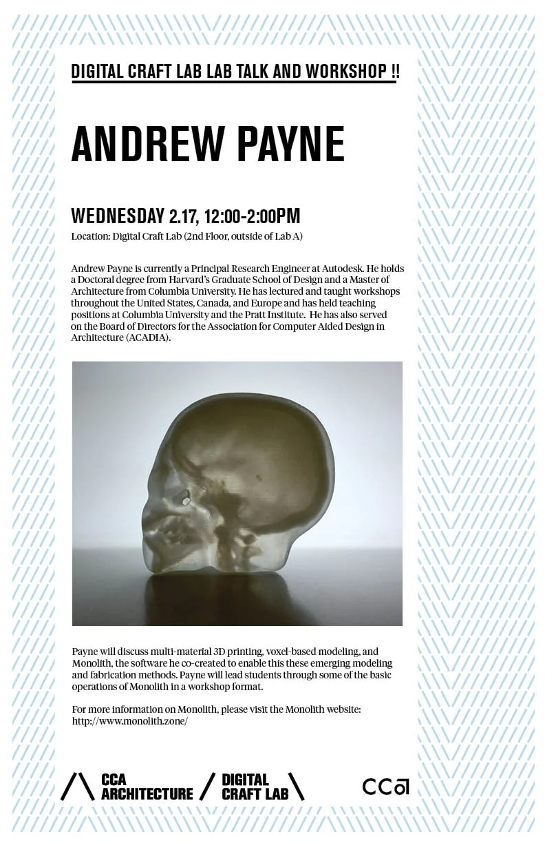 Andrew Payne will discuss multi-material 3D printing, voxel-based modeling, and Monolith, the software he co-created to enable this these emerging modeling and fabrication methods. Payne will lead students through some of the basic operations of Monolith in a workshop format.
