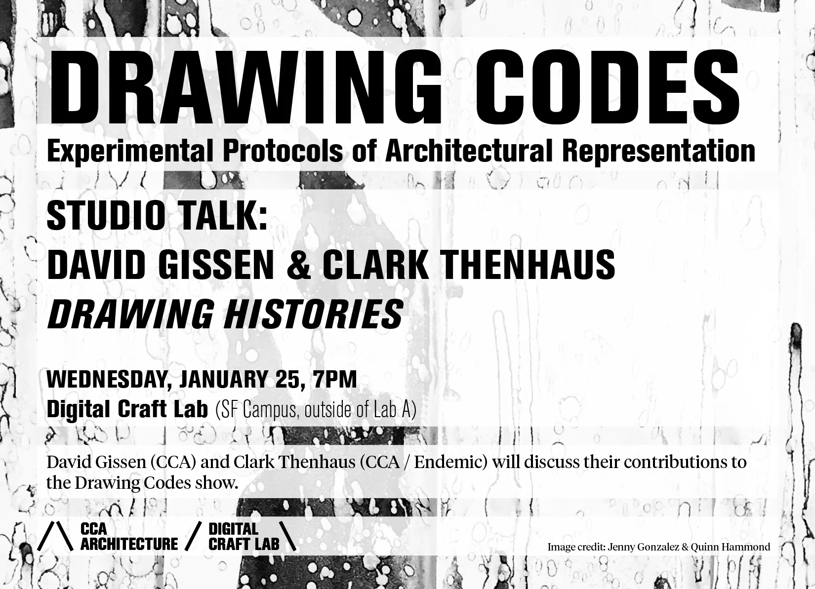 DRAWING HISTORIES: Studio Talk with David Gissen & Clark Thenhaus Wednesday, January 25, 2017 7:00 PM 8:00 PM 19:00 20:00 Google Calendar ICS Organized in parallel with the DCL Drawing Codes exhibition, CCA Faculty David Gissen and Clark Thenhaus (Endemic) will discuss their contributions to the exhibition in the context of history's influence in contemporary architectural representation.