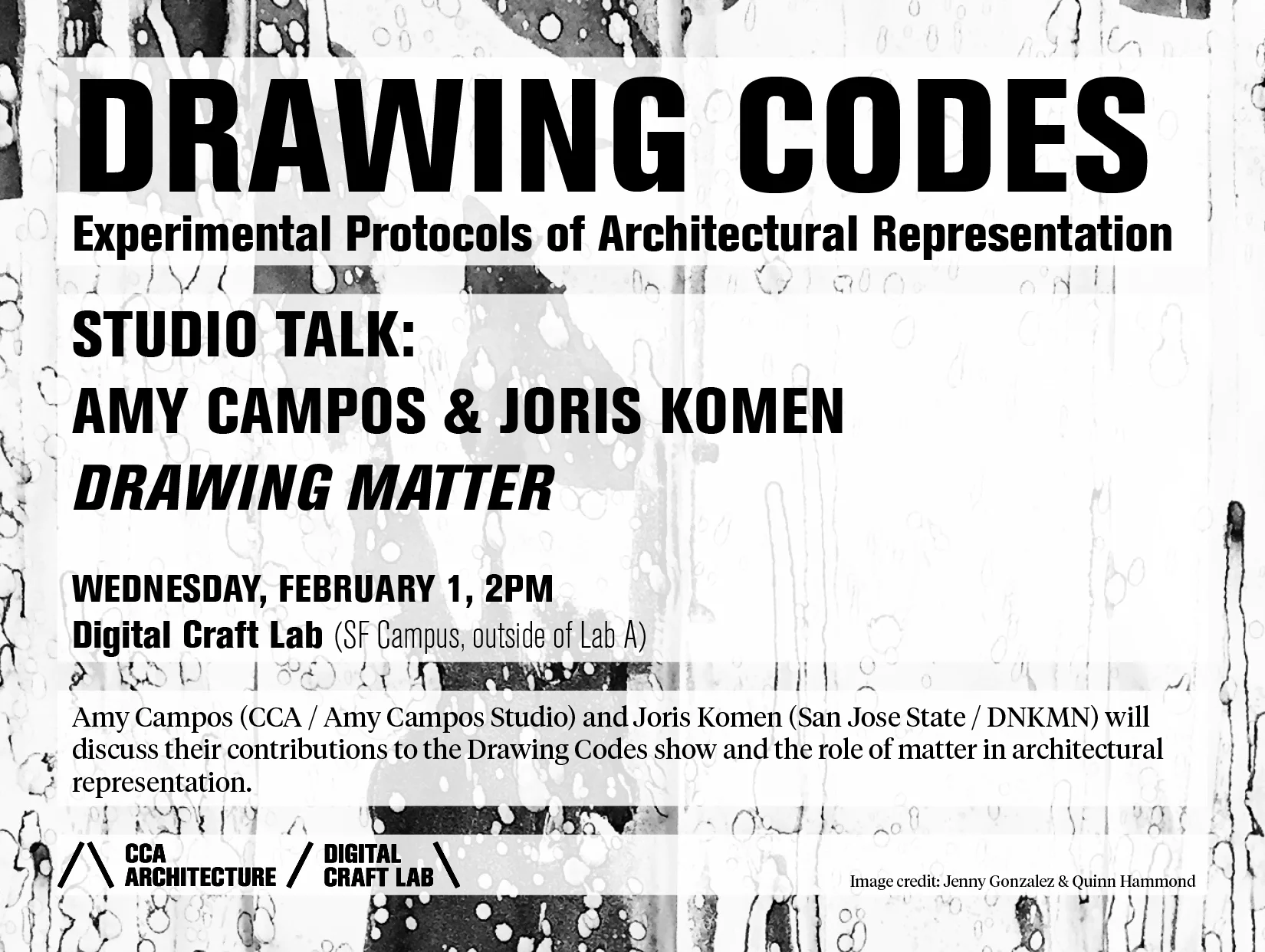 Organized in parallel with the DCL Drawing Codes exhibition, Amy Campos (CCA / Amy Campos Studio) and Joris Komen (San Jose State / DNKMN) will discuss their contributions to the exhibition and the role of matter in architectural representation
